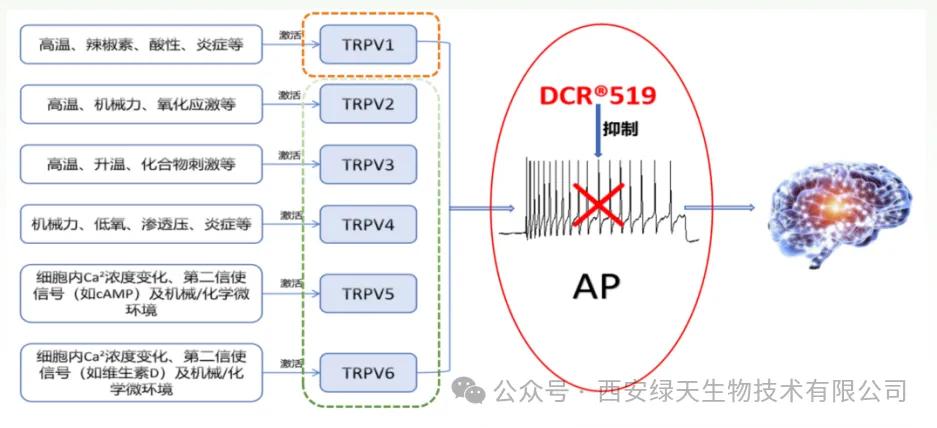 相较于传统的 TRPV1 靶点,抑制动作电位(AP)能更全面地阻断多种刺激信号的传递。具体来看,皮肤中分布着六种已知的 TRPV 受体,不同受体负责感知不同类型的刺激,而传统 TRPV1 靶点活性物通常仅对单一受体起效,对其他类型的 TRPV 受体基本无敏感作用。 然而,无论何种 TRPV 受体被刺激激活,其产生的刺激信号最终都需通过动作电位(AP)的形式传递至大脑。因此,通过抑制动作电位(AP),可实现对各类刺激信号传递的最大化阻断,发挥更广泛、更高效的抗刺激作用。