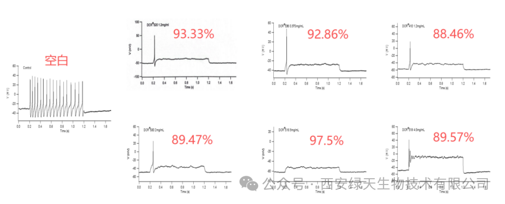通过多组实验验证,西安绿天研发的不同批次的卡瓦胡椒根提取物对动作电位(AP)的抑制效果稳定且优异,抑制率均维持在 90% 左右,具体数据如下: