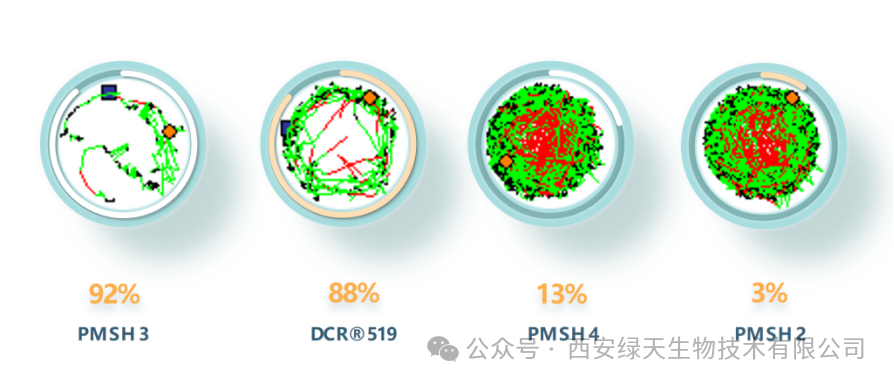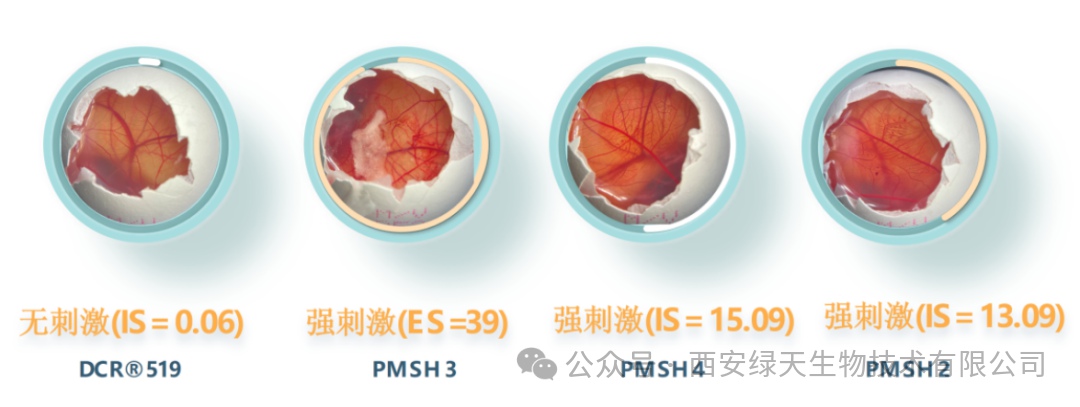 为明确 DCR®519 在行业内的抗刺激水平,西安绿天团队选取四款市面上热门抗刺激原料(分别标记为PMSH1、PMSH2、PMSH3、PMSH4),在鸡胚、斑马鱼和人体三个不同实验模型下进行同浓度对比测试,结果如下: