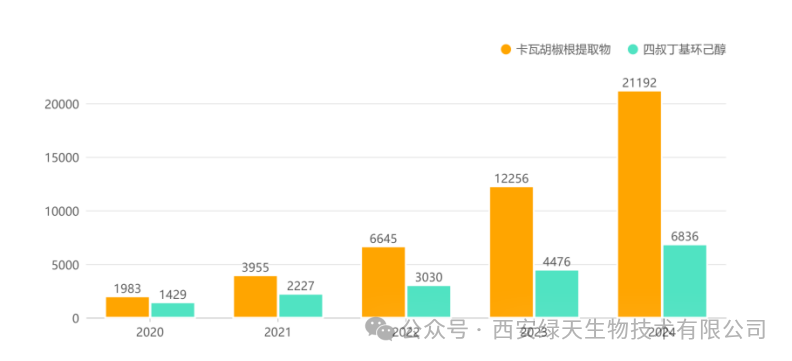 从数据可见,近五年卡瓦胡椒根提取物的备案数量均大幅领先于 4 – 叔丁基环己醇,而且这种差距逐步扩大,在2024年,卡瓦胡椒根提取物基本是对方的三倍之多。这个数据充分说明国产卡瓦胡椒根提取物已获得市场高度关注与广泛认可。