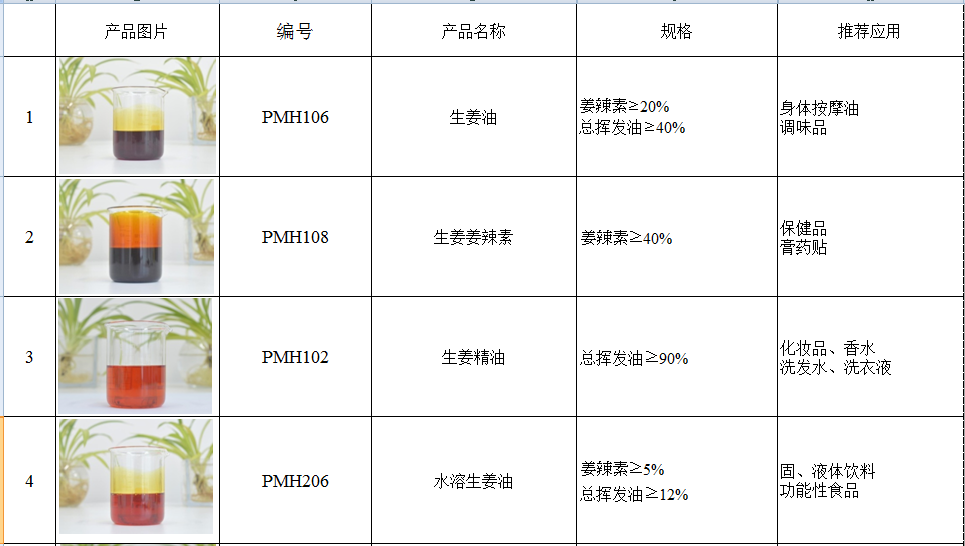 下面是我司工程师对常规用途的领域,推荐与之匹配的生姜油。 如您有更具体的需求,您可以联系我们sales@plamed.cn