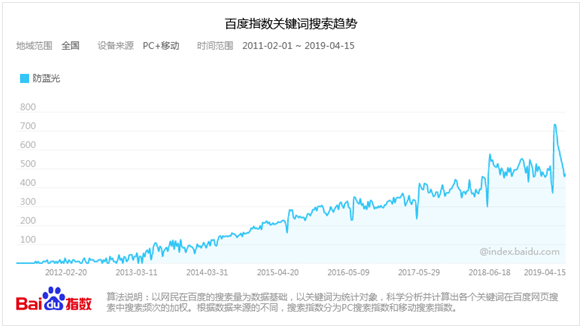 西安绿天从2017年开始关注并投入研究抗蓝光原料,我们整理了2011年到2018年的抗蓝光国内关注度趋势(数据来源于百度指数)。
