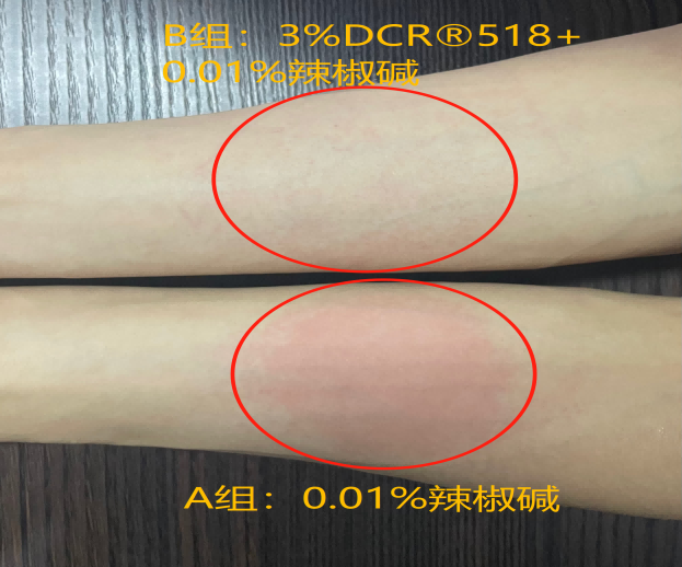 该实验分为A、B两组,A组为空白对照组,将10滴0.01%的辣椒碱滴于斑贴试纸上;B组为DCR®518试验组,将10滴配制好的含0.01%辣椒碱和3%DCR®518的溶液滴于斑贴试纸上,将A、B两组同时贴于左右胳膊上,30min后撕下斑贴,结果如下: