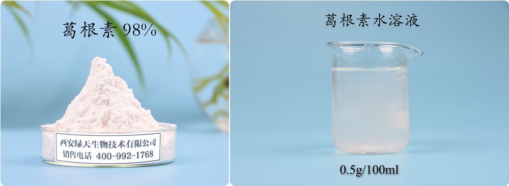 葛根素(Puerarin)是葛根黄酮中的一种异黄酮类单体,约占葛根异黄酮总量的50%,是其重要组成部分。葛根素存在于豆科植物野葛的干燥根茎中,含量约占2.3%。绿天公司生产的葛根素为98%的植物化妆品级原料,为白色结晶粉末,微溶于水,可溶于甲醇、热乙醇和乙酸乙酯,在碱性溶液中不会引起糖苷的水解。