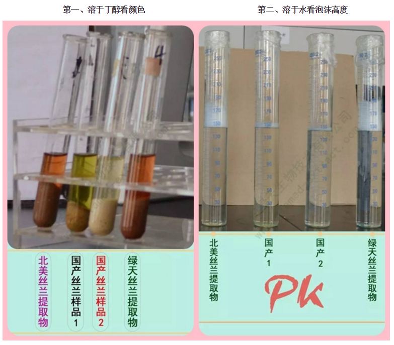 结论:通过丁醇溶解后的颜色、泡沫高度和TLC及图谱鉴定对比,国内原料生产用的丝兰,和绿天生产用的北美丝兰,不是一个品种,且活性成分完全不一样,所以国内丝兰原料,不能作为除臭剂。
