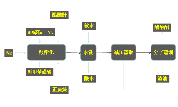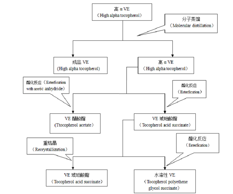 α-生育酚的保质期在两年,两年之内无论形态还是颜色都不会变化,但是将α-生育酚酯化后得到的α-生育酚醋酸酯都将更稳定,保质期可达五年之久。也由于酯化后酚羟基被保护起来,生育酚酯类产品不容易被氧化,因而比生育酚稳定,从而给生育酚制品的储存、运输等带来极大的方便。